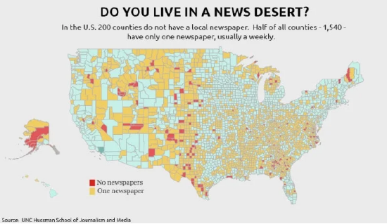 在这场媒体行业悲歌中,那些本地小媒体是受影响最大的。据美国西北大学新闻学院去年年底统计,自2005年以来美国已经有超过2500家本地媒体倒闭,有200多个郡(大致相当于中国的地级市)甚至已经没有了本地媒体,而在超过一半的地区,当地只有一家本地媒体。